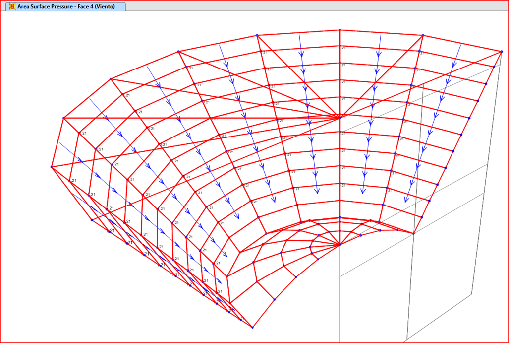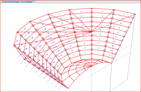 Cuando se aplica el viento en dirección y sentido en el modelo una de las partes del mismo se encontrará presionada y la otra succionada. Normalmente este valor se debe calcular, pero se puede tomar de valor igual para ambos casos. En el caso de aplicación de la carga de viento que has colocado tu, el viento viene por todas las direcciones a la vez. Tendrías que discretizar el modelo en dos mitades, y aplicar estas cargas en un mismo sentido (para simular por el otro lado la carga de succión).